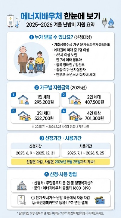 - 동절기(겨울) : 2025년 10월 1일 ~ 2026년 5월 25일 (전기·도시가스·지역난방·국민행복카드)