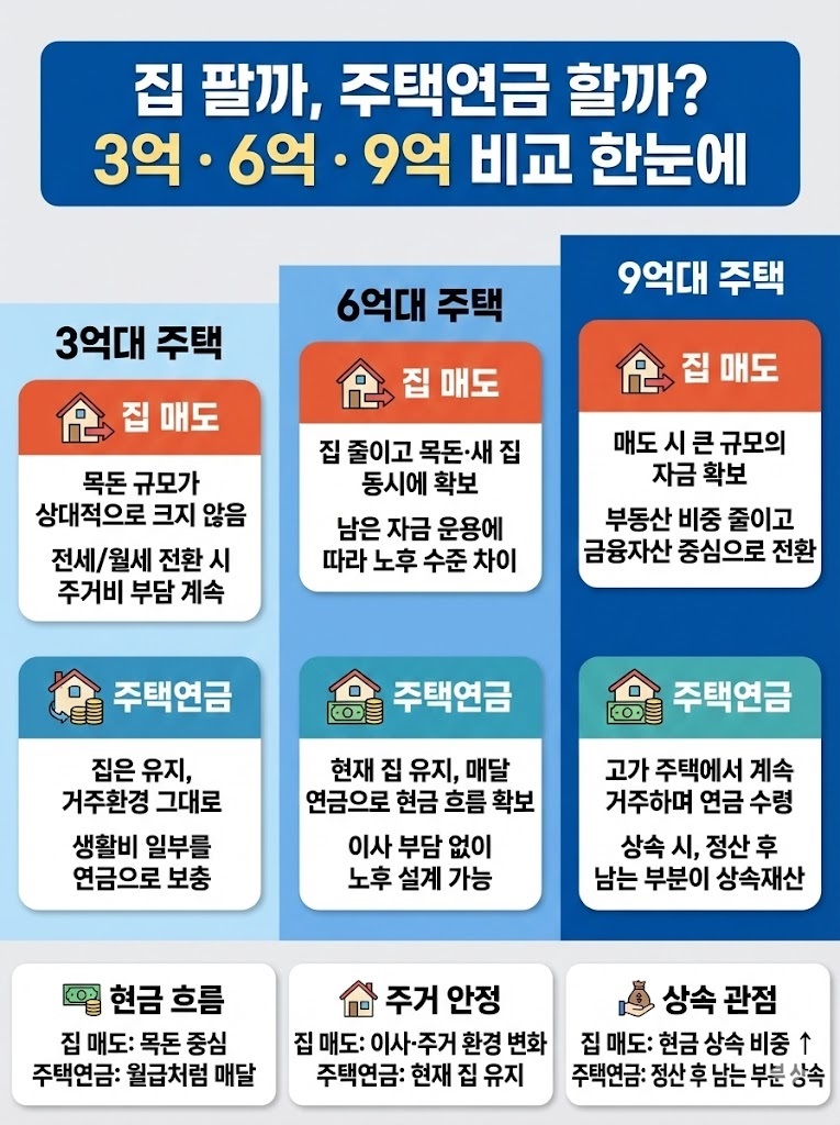 3억·6억·9억 구간별 ‘집 매도 vs 주택연금’ 핵심 차이를 정리해 두었습니다.